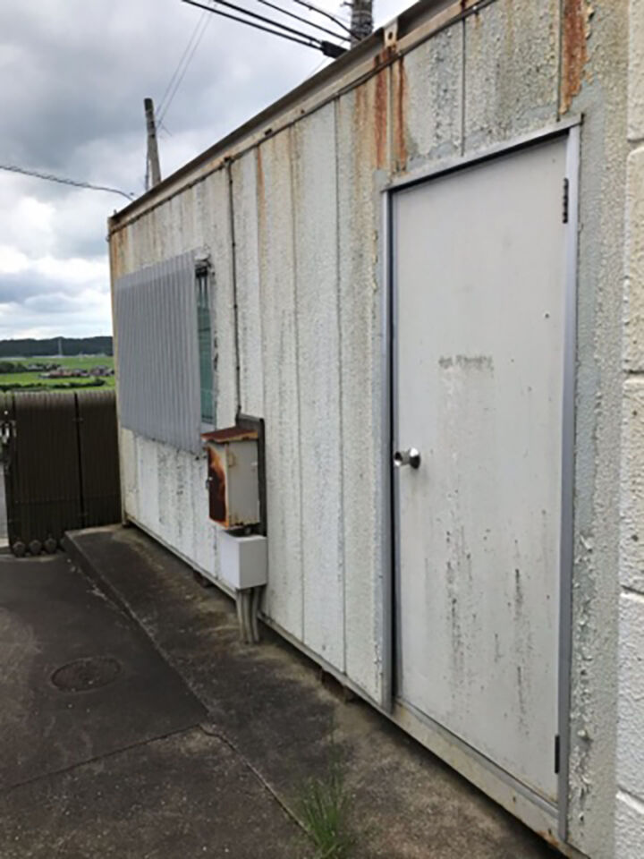 外壁が傷んできたため、塗装工事のご相談。事務所社屋の他に、プレハブ小屋と鉄骨造の建造物の塗装のご依頼もありました。