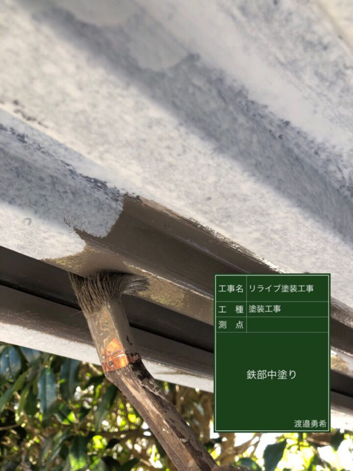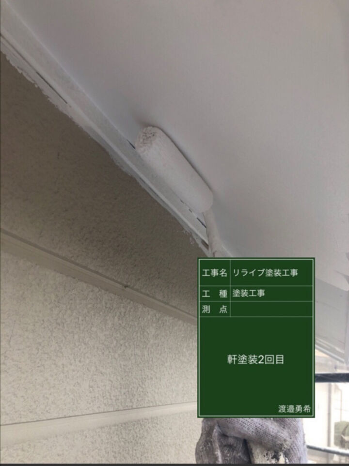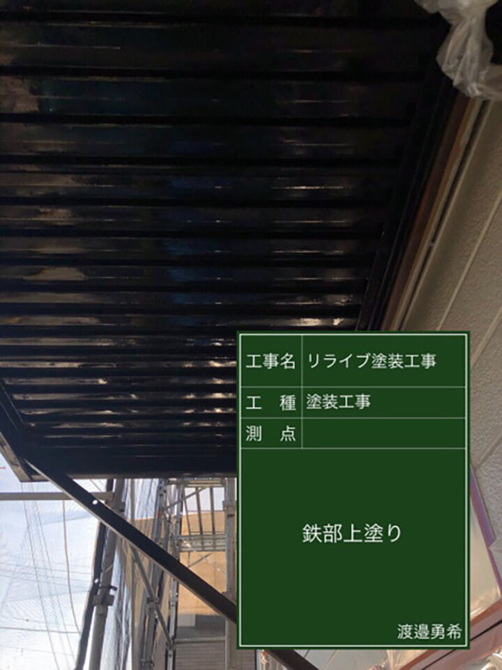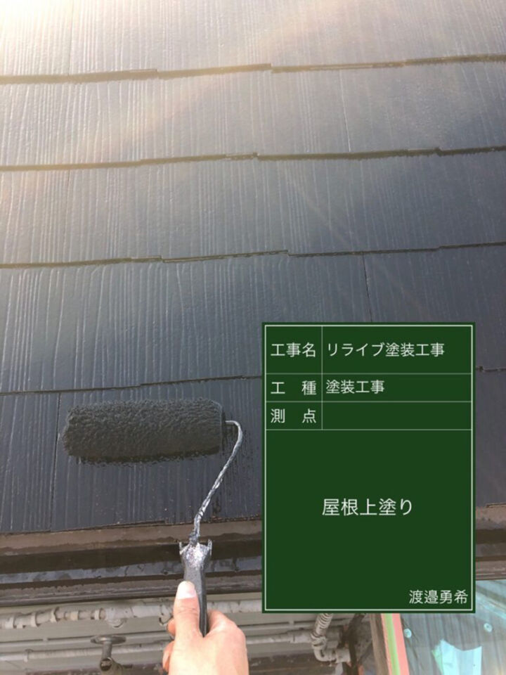 中塗りが完了したら、上塗りを行います。同じトップ剤を使用しているので塗り残しが出ないように施工の順番を決めて全面をローラーで塗装しました。