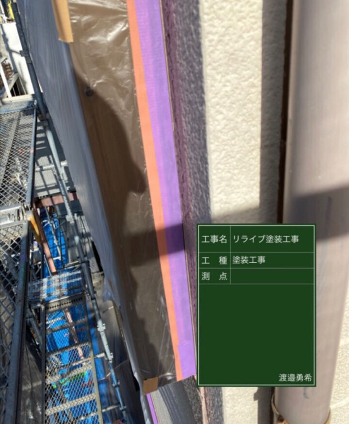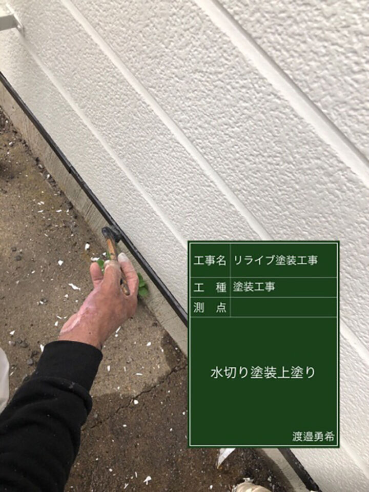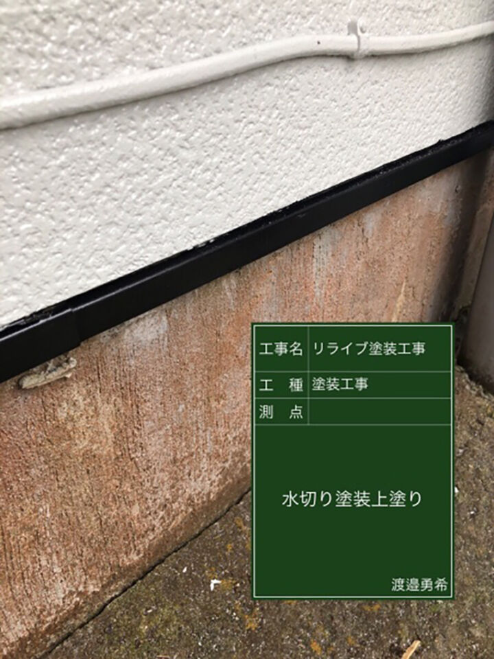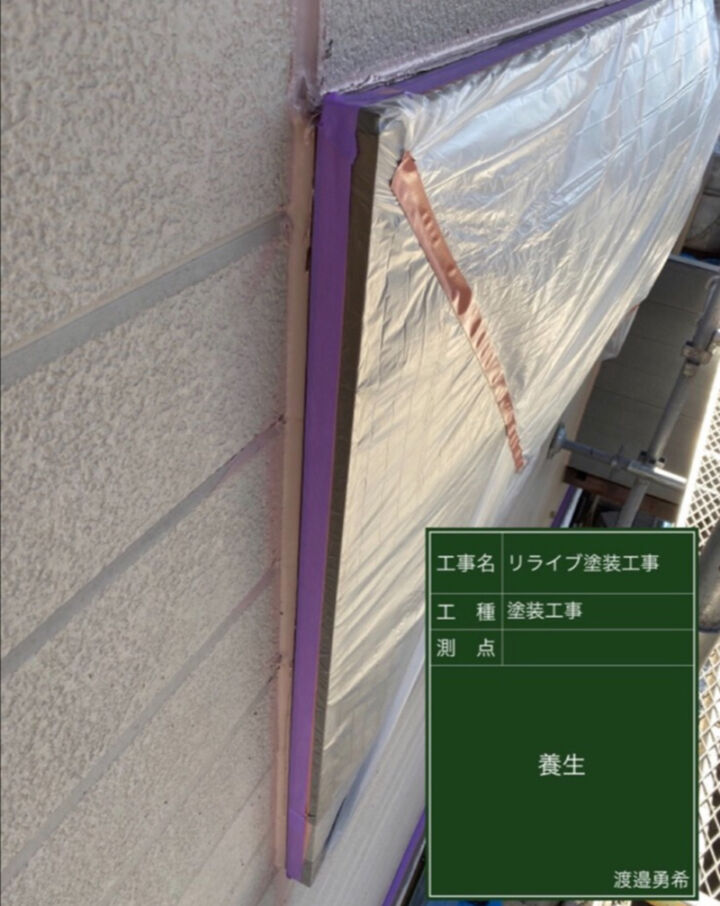 続いて塗装する水切は基礎土台と外壁の間に設置されているため、外壁塗装で基礎が汚れないように一緒に養生してありました。