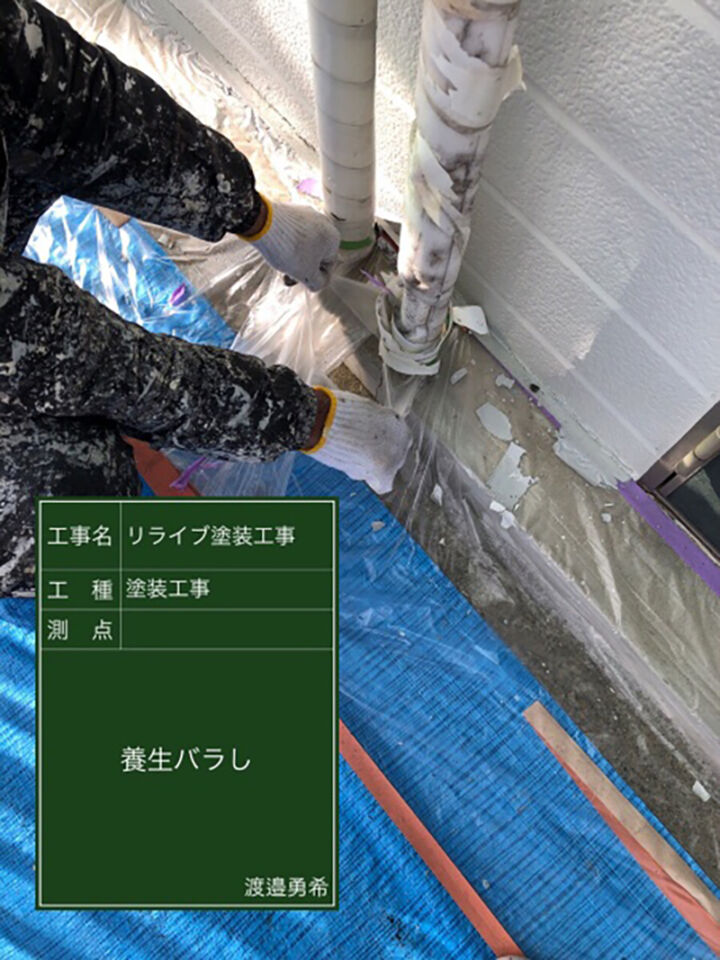 塗装を行わない場所は塗料の飛散予防に養生テープと養生シートで保護していきます。