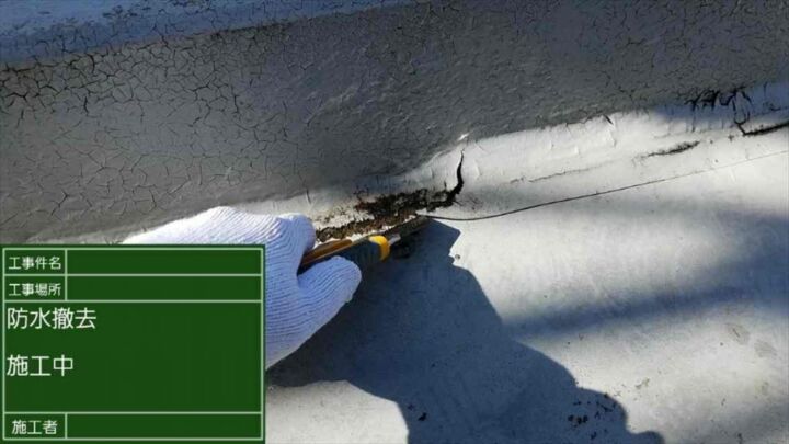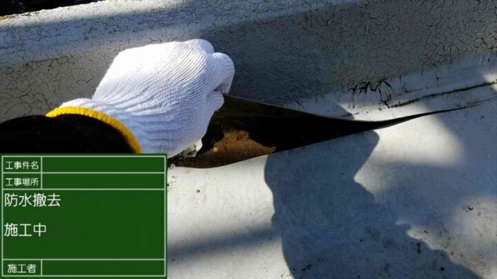 屋上の防水層の工事を行う前に古い防水層を剥がしていきます。