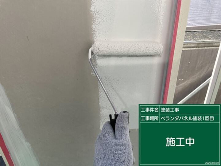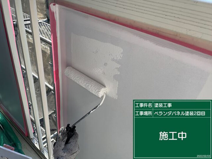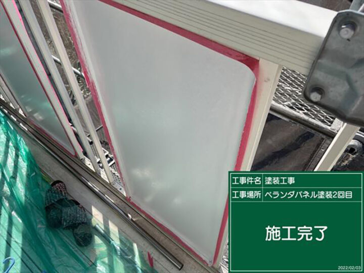 ベランダの目隠しパネルの塗装をおこないます。こちらも2回塗り重ねで塗装完了です。