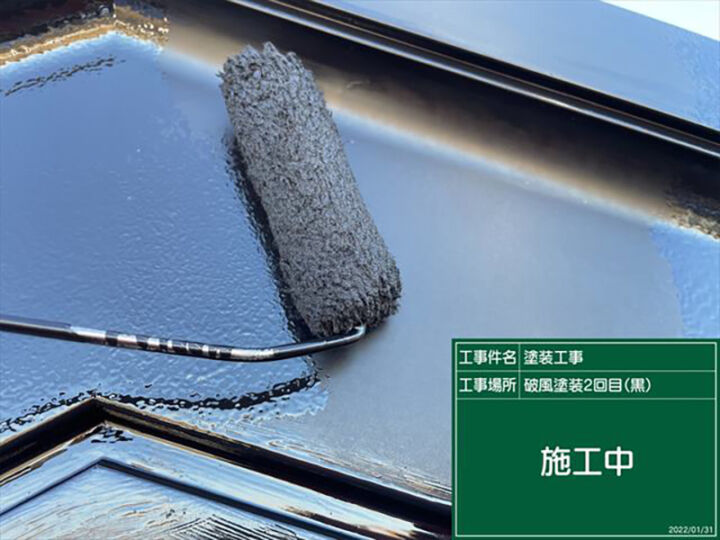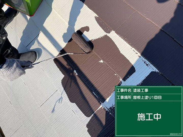 今回の屋根のスレート材は劣化が進んでいたので、下塗りを2回おこなうことになりました。左が2回目の下塗りの作業のようすです。右の写真は、2回目の下塗りが完了した屋根です。遮熱性が高い塗料を使用したので、夏場は温度上昇を防ぐ効果が期待できます。