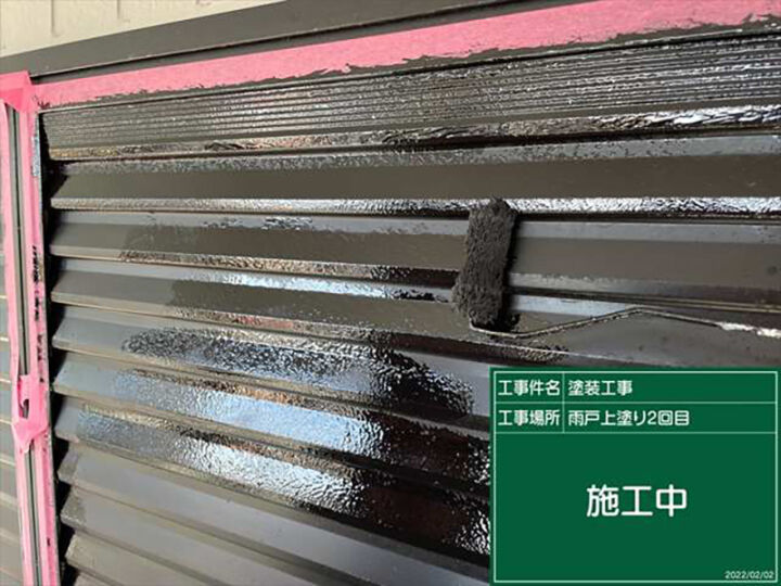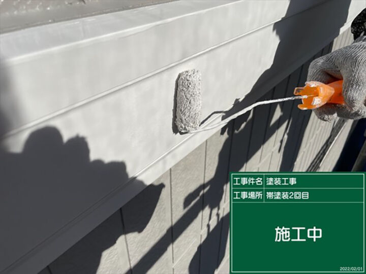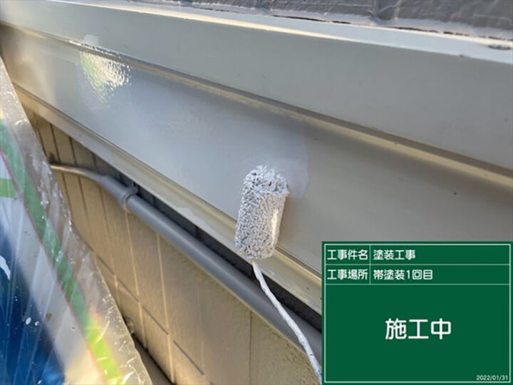 帯板の塗装のようすです。1回目の施工が左の写真です。2回目の施工のようすが右の写真です。帯板は外壁よりも劣化が起きやすい場所なので、耐候性の高い塗料を使用しました。