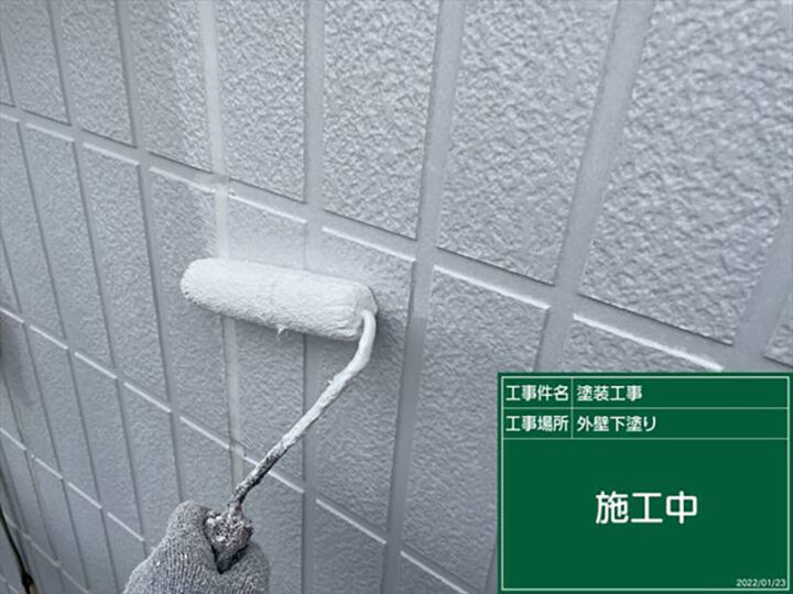外壁の下塗りをおこないます。屋根は2回の下塗りが必要でしたが、現場調査の結果で外壁は著しい劣化はなかったので、通常通り下塗りは1回となりました。
