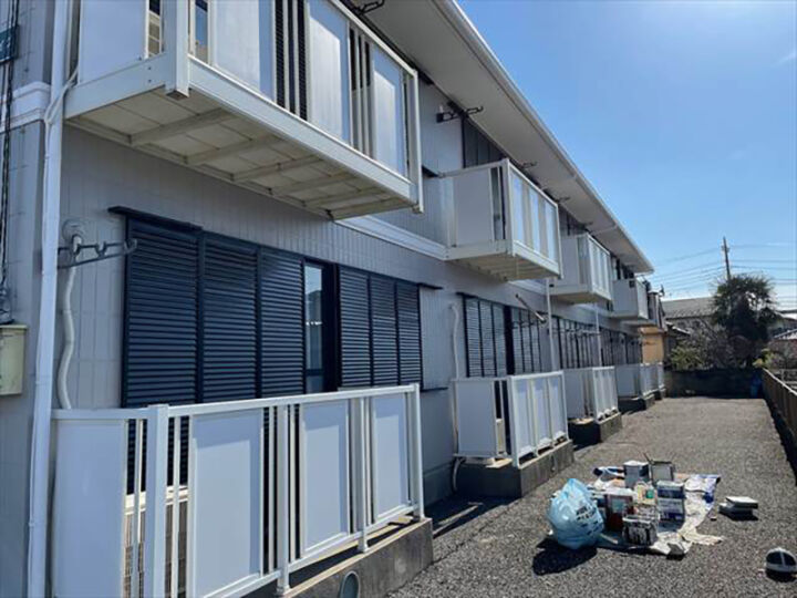 軽量鉄骨スレート葺のアパートを1棟まるごと高耐候性の塗料で塗り替えます