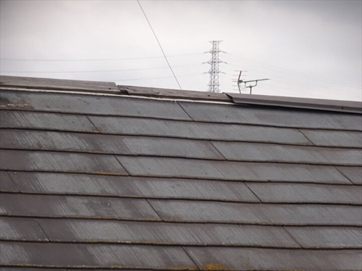 現場調査で確認した際のスレート屋根と棟板金です。左の写真の屋根の棟板金(頂点部分)が外れて下地材が見えています。右の写真では、スレート材の劣化が進み苔が生え茶色っぽく変色し、塗膜が剥がれてしまっているところも確認できます。