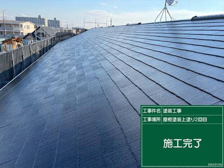 2回目の上塗りが終わり、乾燥も完了したスレート屋根です。劣化が進んでいたスレート屋根が見違えるほどキレイになりました。
