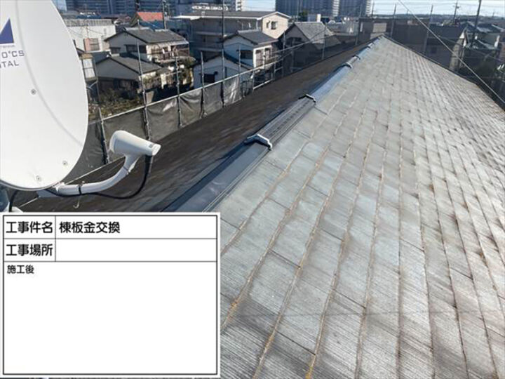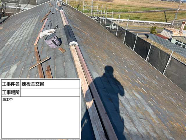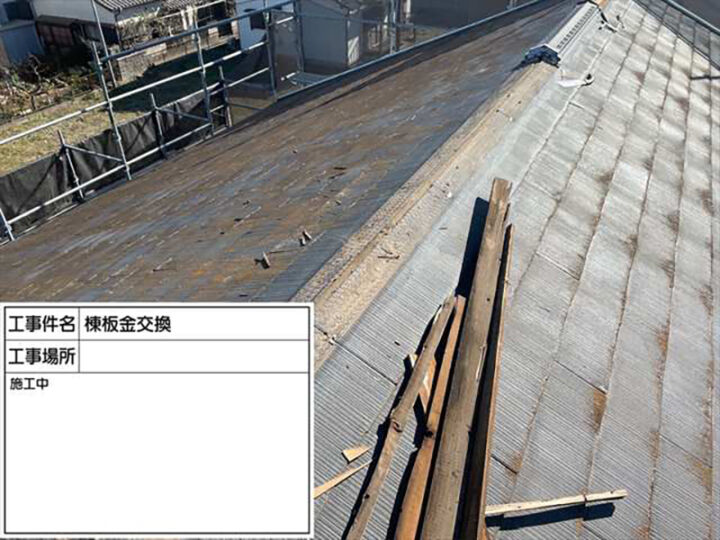棟板金の交換をおこないます。金属の棟板金を取り外し、左のように木材の下地材を撤去していきます。次に中央の写真の新しい下地材を設置します。最後に棟板金も新しい物を取り付けて右の写真の状態になりました。