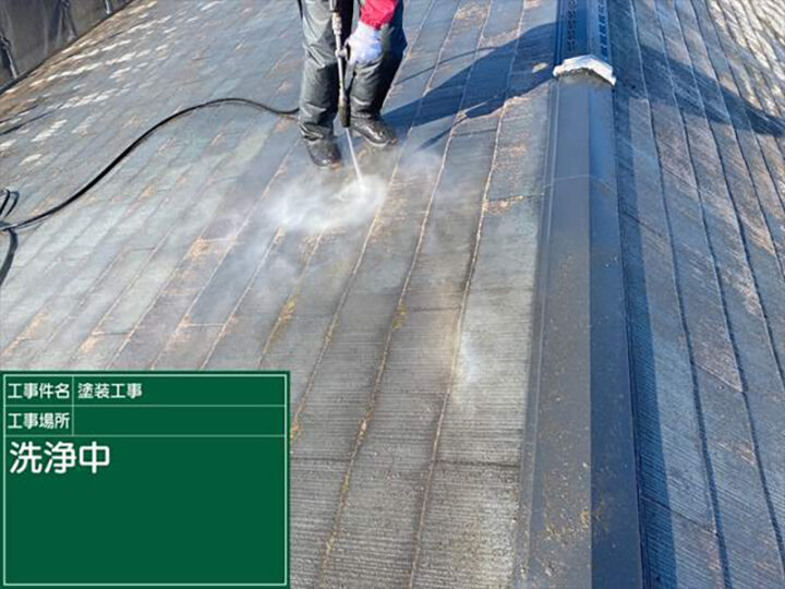 左は洗浄前の写真です。右は洗浄中の写真です。上から洗浄しているので棟板金のあたりは茶色い苔汚れが落ちています。