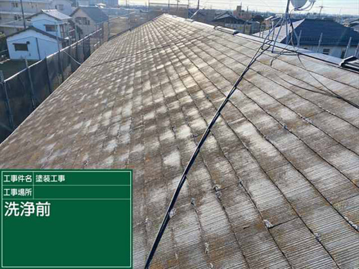 スレート屋根は苔が生え劣化が進んでいて、棟板金の交換も必要な状態でした。元々ツートンカラーだった外壁を清潔感のあるホワイトに変更します。