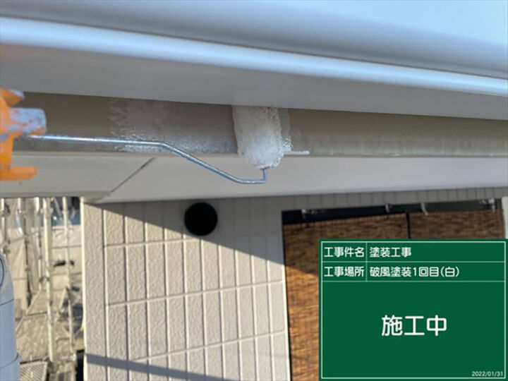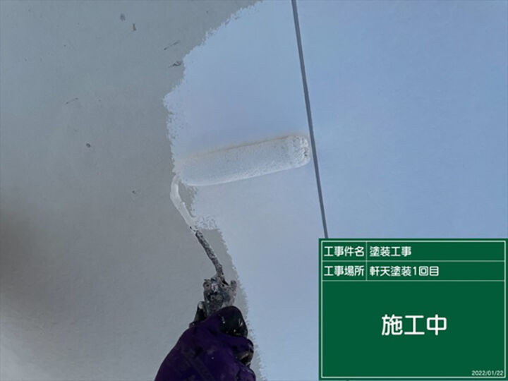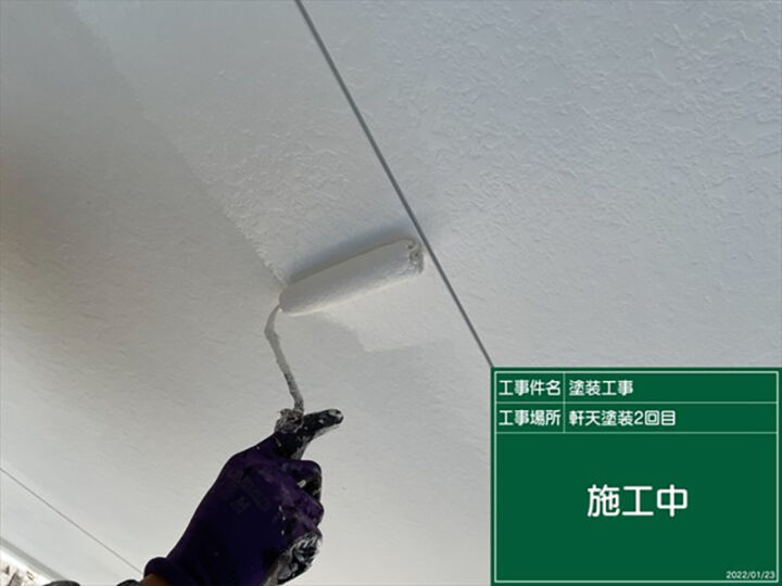 軒天の塗装をおこないます。アパートなので、共有通路の軒天とベランダ側の軒天の塗装をおこないます。左の写真は、共有通路の1回目の塗装のようすで、右の写真が2回目の塗装のようすです。