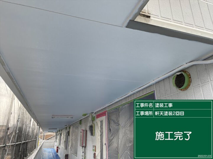 2回目の塗装が完了した共有通路の軒天の写真です。湿気が溜まりやすい軒天は、防カビ・防藻の効果の高い塗料を使用しました。