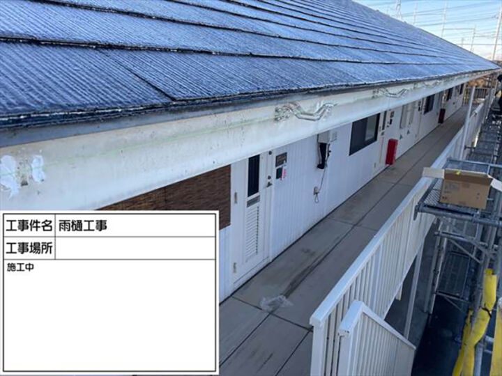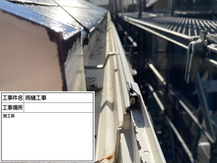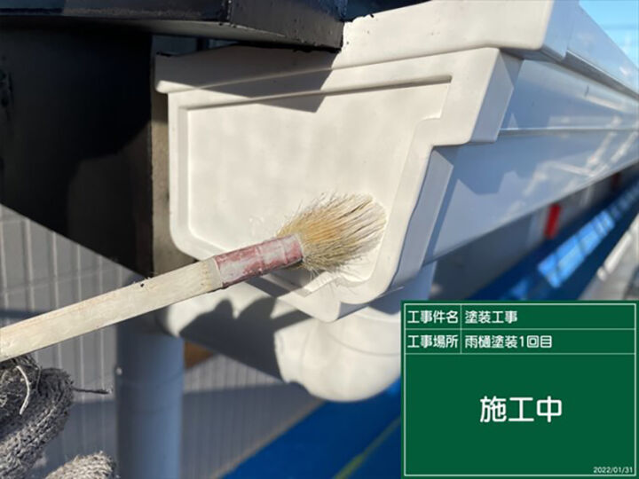 新しい雨樋を取り付けたようすと、塗装をおこなっているよすうです。雨樋も劣化に強い塗料で塗装しています。