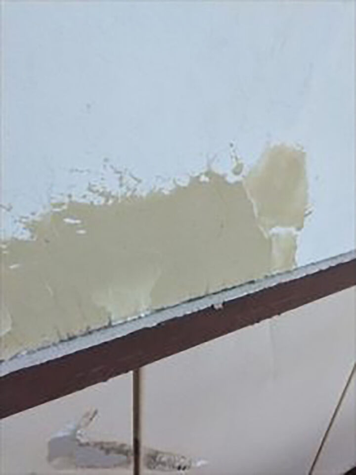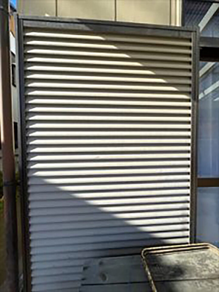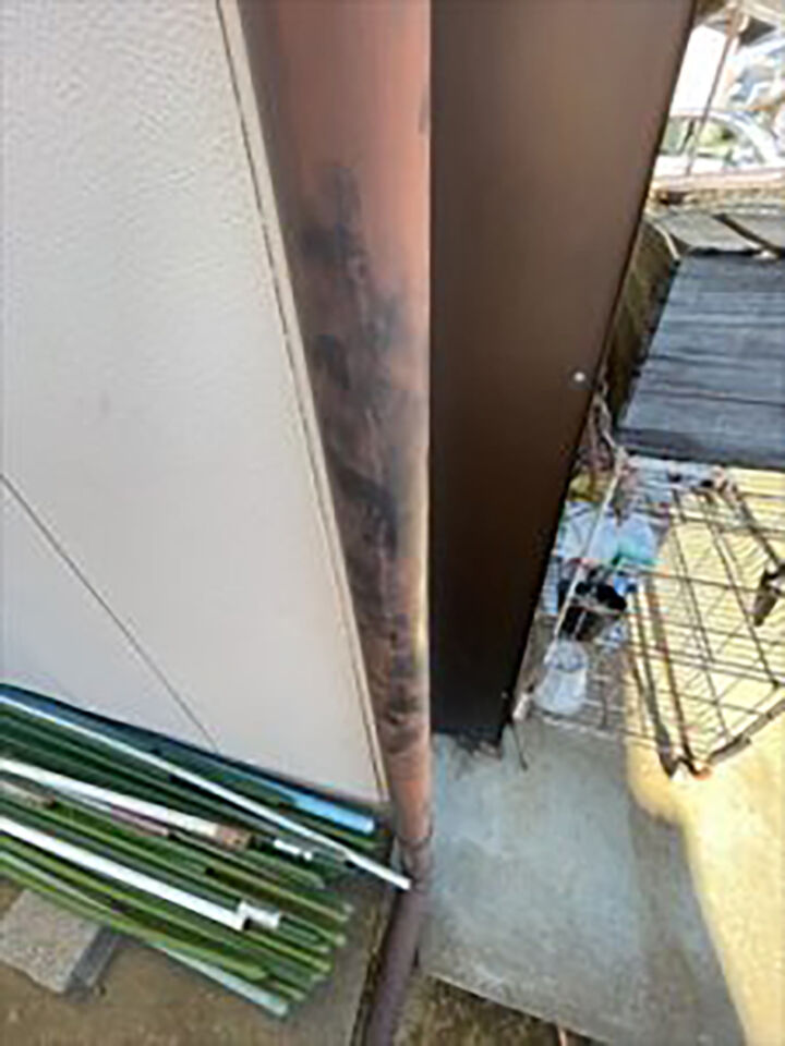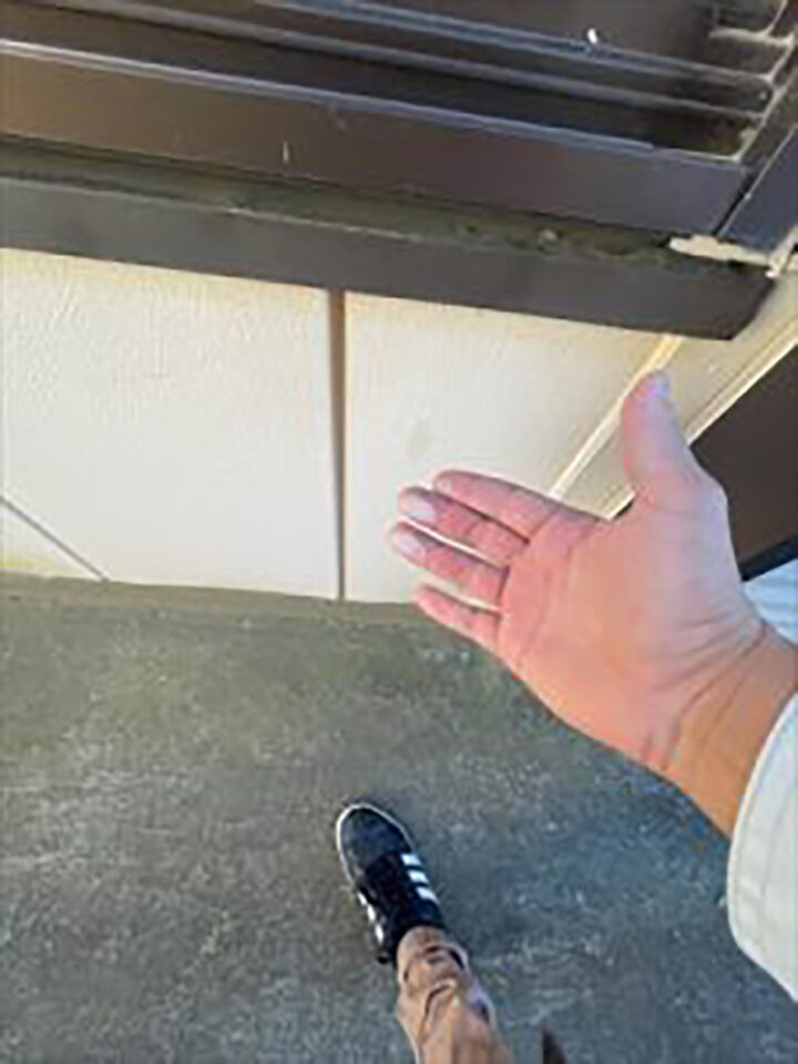 外壁は金属サイディングです。外壁に触れると指先にチョークのような白い粉のようなものが付着しました。これは、塗膜内の樹脂が紫外線などで劣化したものです。この現象をチョーキングと呼びます。チョーキングが起きている外壁は防水性が低下しているの、早めの塗装が必要です。
