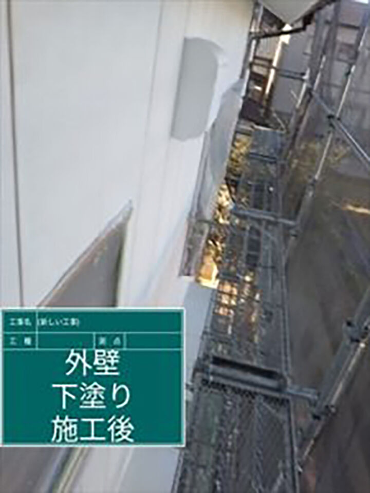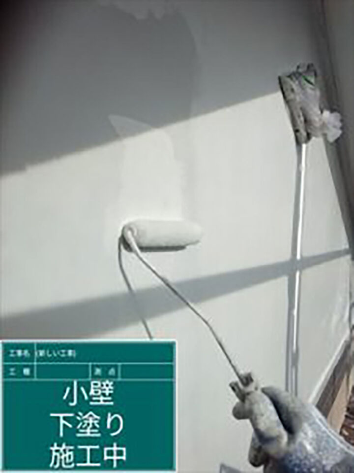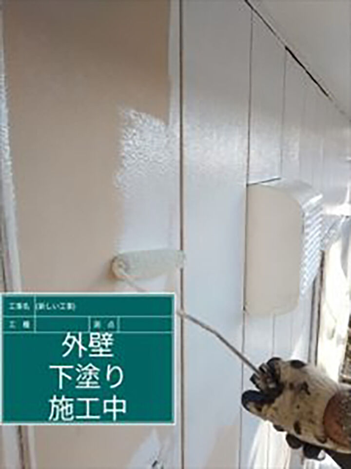 サッシやガスや電気のメーター類、エアコン室外機に塗料の付着を防ぐため、ビニールやテープなどを使い養生をおこないってから塗装作業を開始します。外壁の下塗りをおこないます。