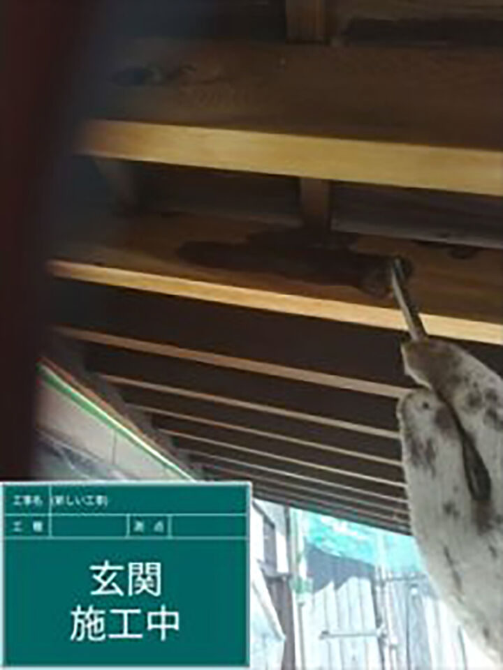 玄関前の化粧垂木と丸柱の塗装をおこないます。木材は紫外線と雨の影響でシミができたり、色褪せが起きています。防虫・防カビ・防藻の効果のある塗料を使用しています。この塗料は表面を覆うのではなく、内部に浸透する塗料なので、塗膜が剥がれてそこから虫の被害に遭うということがありません。