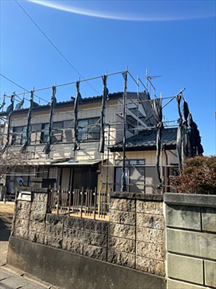 足場を組み、飛散防止シートを取り付けて、いよいよ施工開始です。