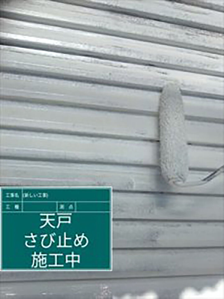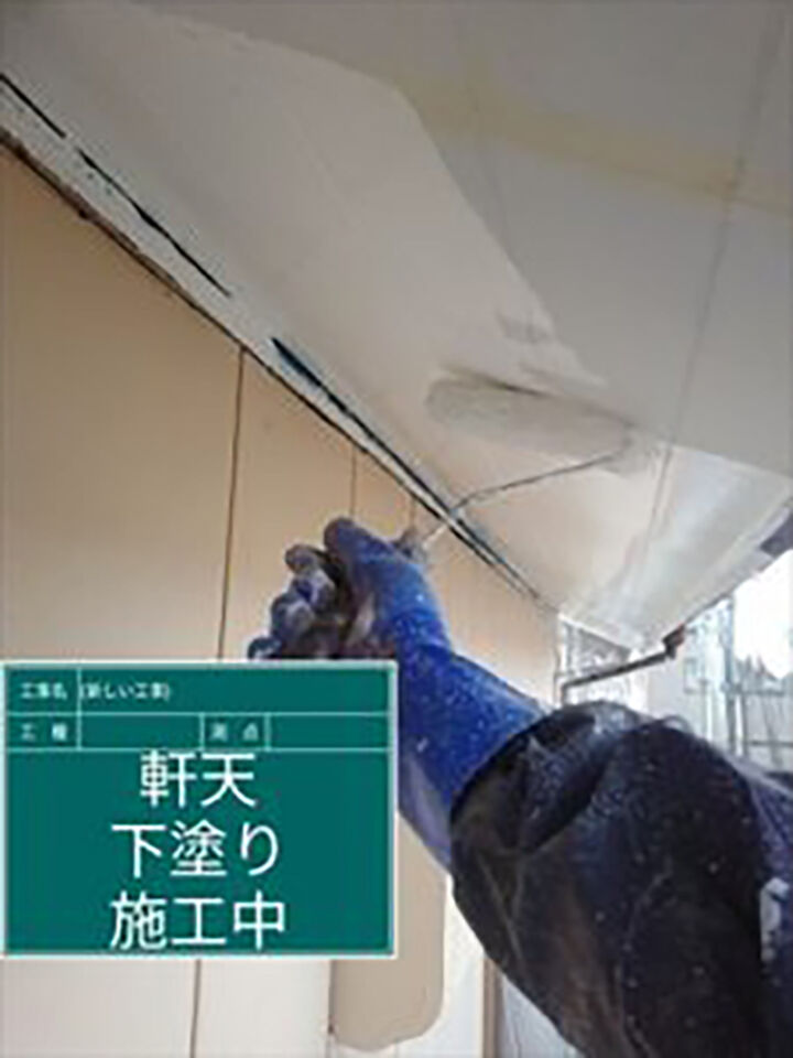 軒の屋根は金属製なので、サビ止めの効果がある塗料で下塗りをおこない、高耐候性の塗料で中塗りをおこなっている写真です。