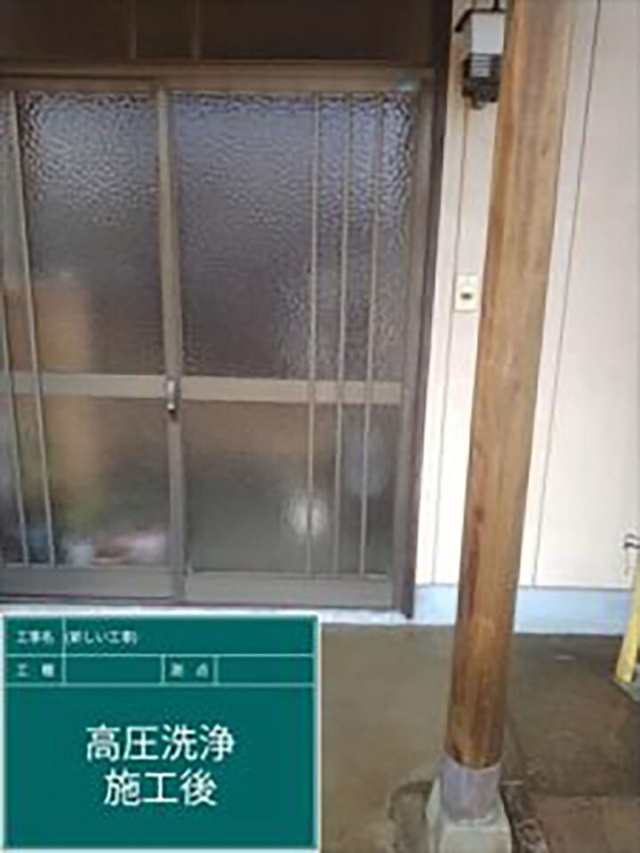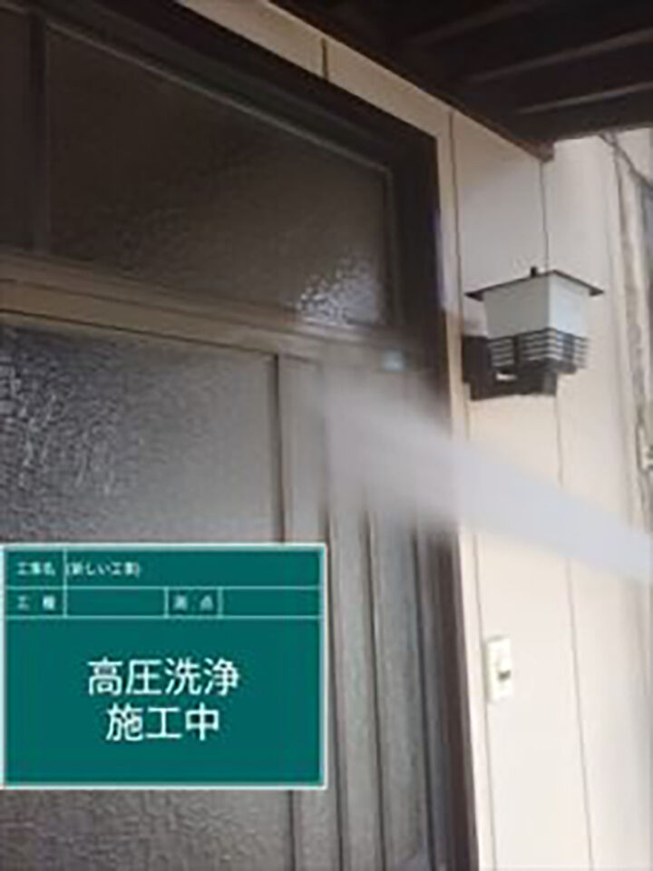 塗装を始める前に、高圧洗浄機を使用して汚れや埃を洗い流していきます。外壁は、劣化してチョーキングを起こしている塗膜ごと洗い流します。