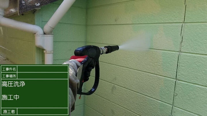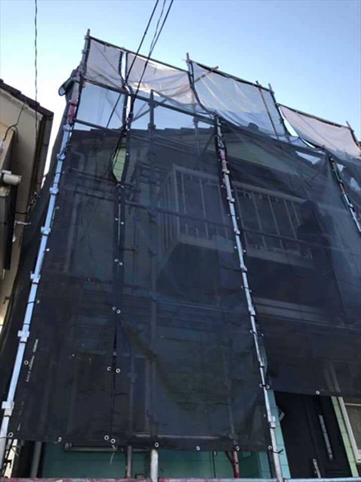 周辺の住宅に洗浄水などのしぶきが飛ばないよう お家ぜんたいにカバーをかけます。