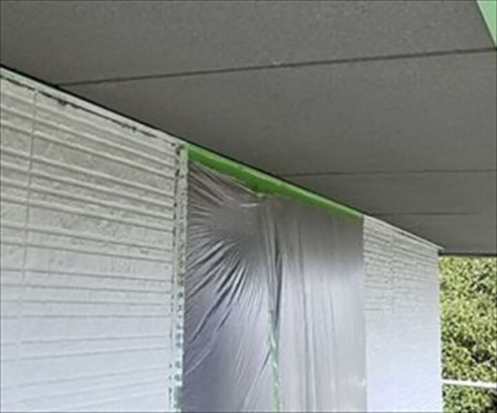 塗料が飛散して汚れないよう窓や手すりなどにカバーをかけます。