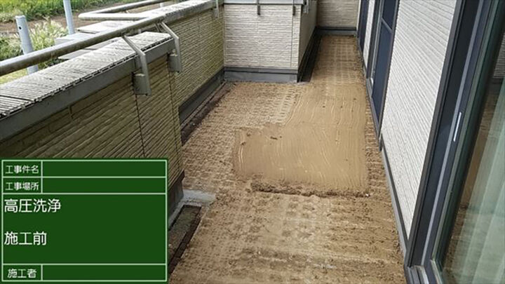 現場調査では 外壁の藻の他、ベランダの床がかなり汚れていることが判明しました。