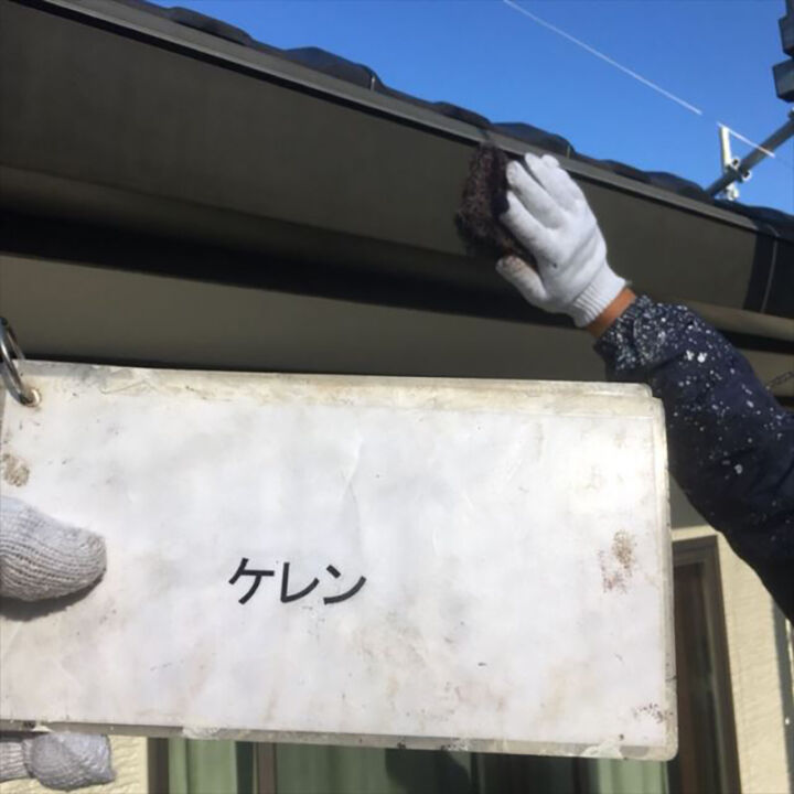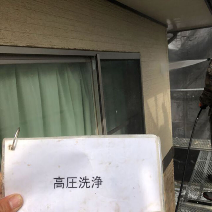 汚れやコケなどを高圧洗浄機を使い洗い流した行きます。この時に塗装を行わないサッシや窓を綺麗に洗います。