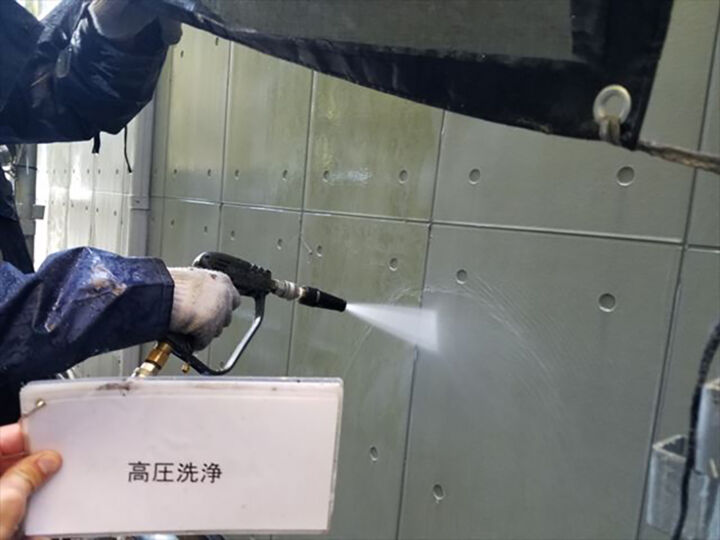 高圧洗浄機で外壁を洗い流していきます。コケやゴミなどを綺麗にしていきます。