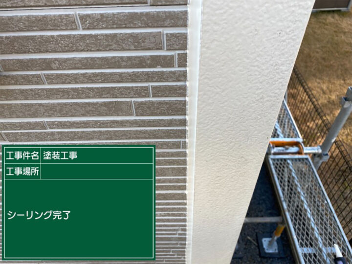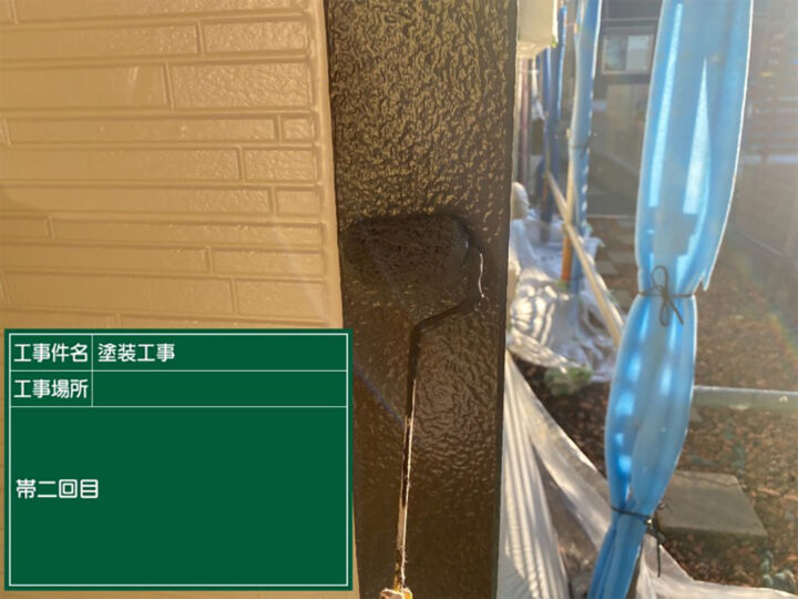 外壁の角に設置された帯コーナーの塗装の様子です。