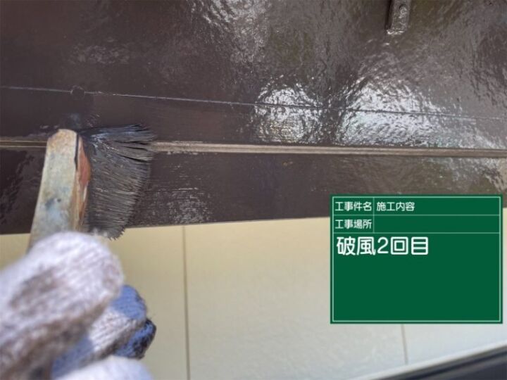 土浦市現場、前回までに1回目の破風板塗装が終わっているので、ハケを使用して2回目の塗装を行っていきます。