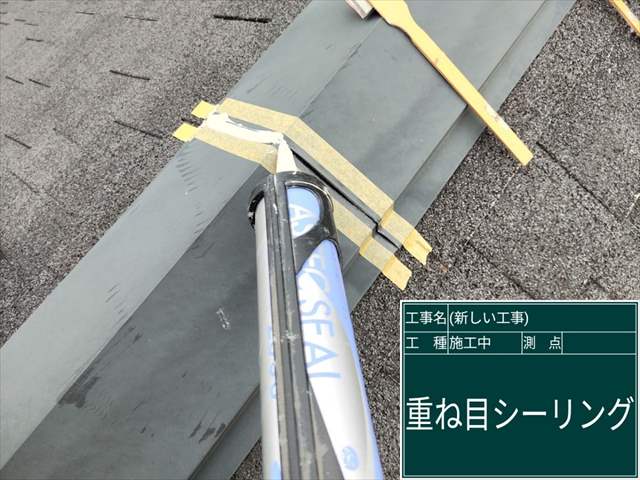 雨水が入る懸念が合った、棟板金の重ね目の隙間もシーリングで補修します。
