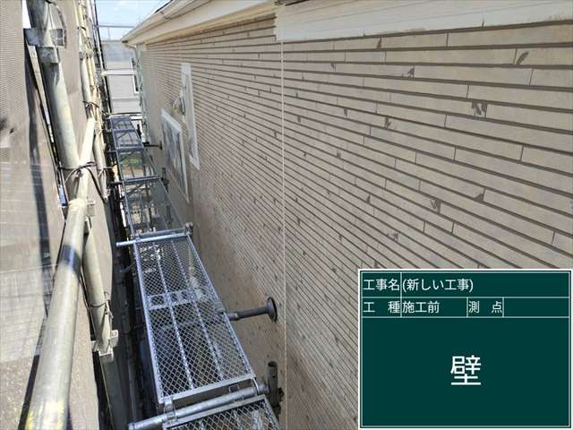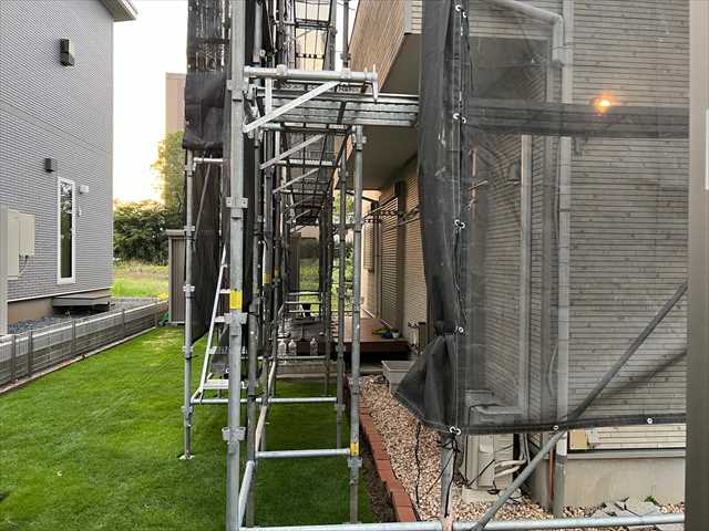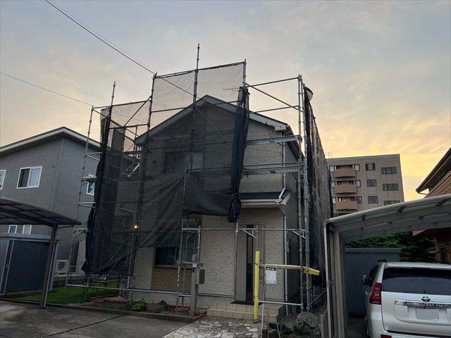 土浦市、築12年の現場、足場を立てて外壁塗装開始です。