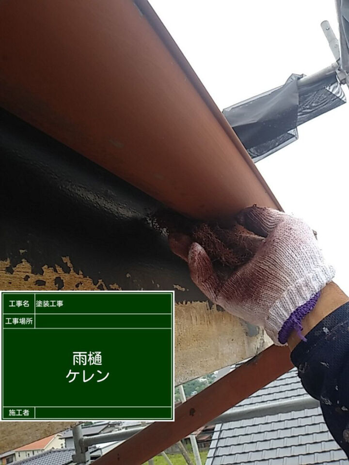 まず、軒樋と破風板の塗装です。