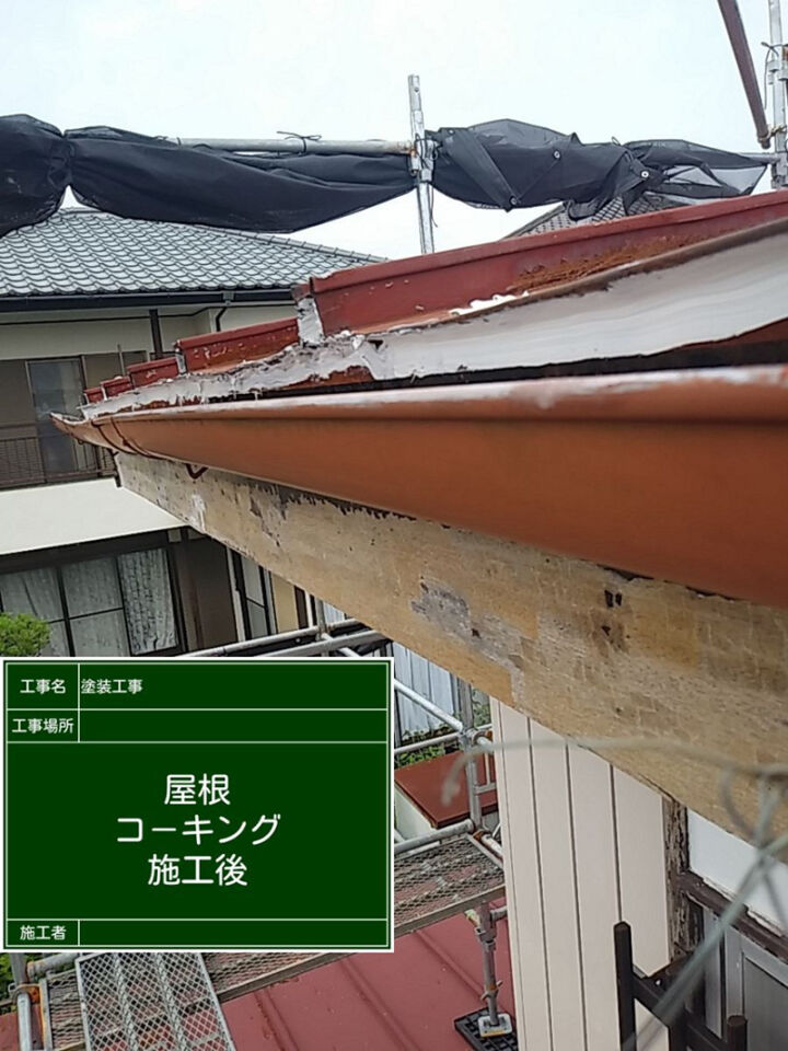 屋根の縁の雨押部分にもコーキングを塗っていきました。