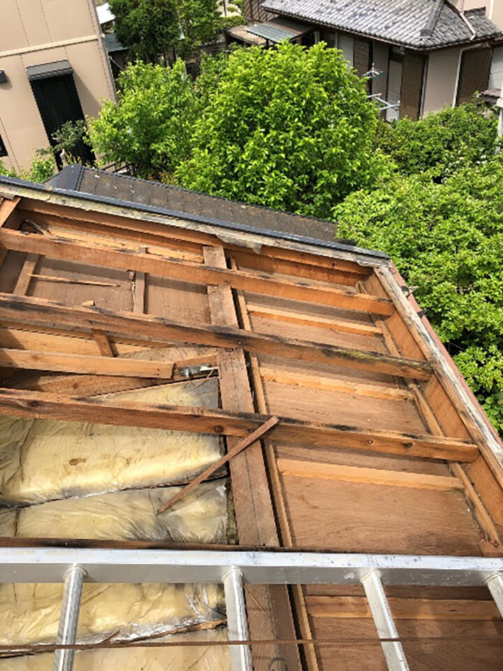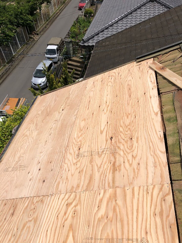 まず、カラーベスト屋根が台風の影響で剥がれて野地板にも大きな穴が空いてしまっていたので補修を行います。