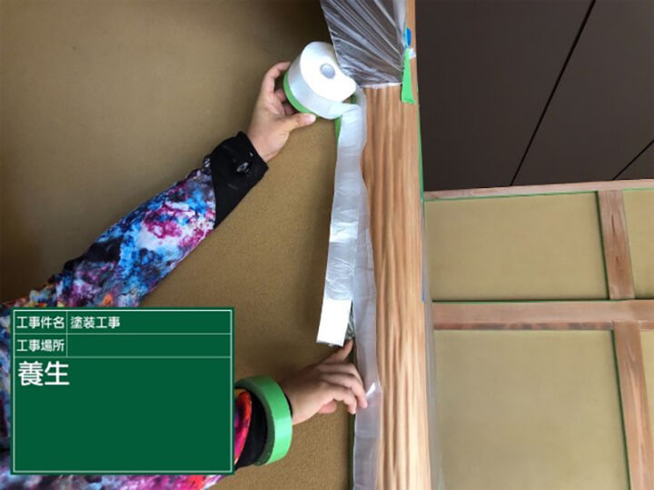汚れてほしくない場所に養生シートをはっていきます。