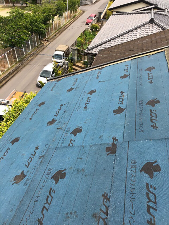 その後、アスファルトルーフィングを敷いた屋根下地に新たにカラーベストを葺いていきました。