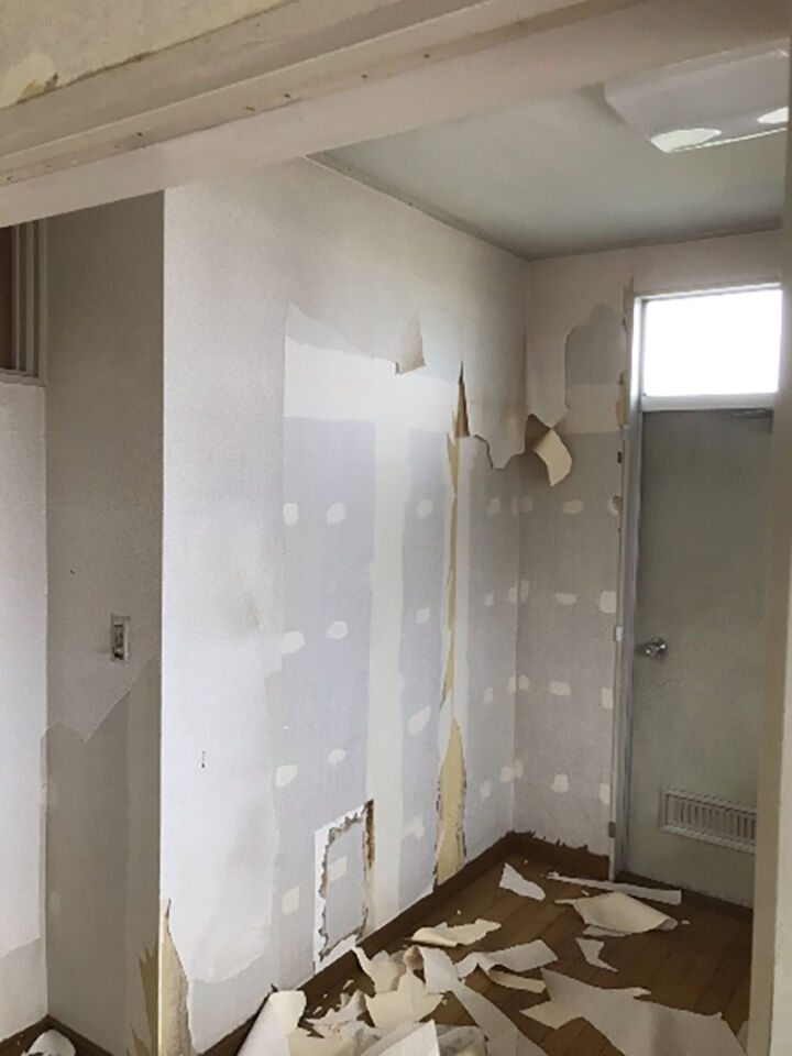 クロス貼りの壁はまず古い壁紙を剥がすところからです。