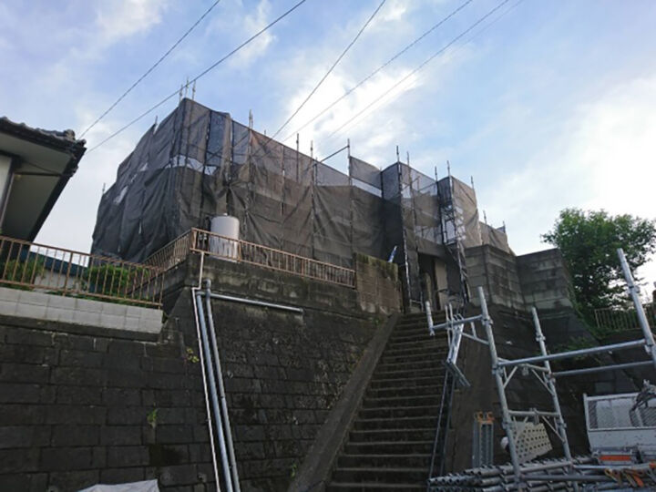 塗装工事業者が足場も組む、という会社もあるようですが、現場と職人・周囲の安全のために弊社では専門の足場業者に設置と解体を委託しています。