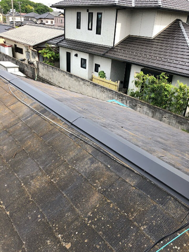 貫板の上から板金を貼り付けて棟の交換が完了しました。