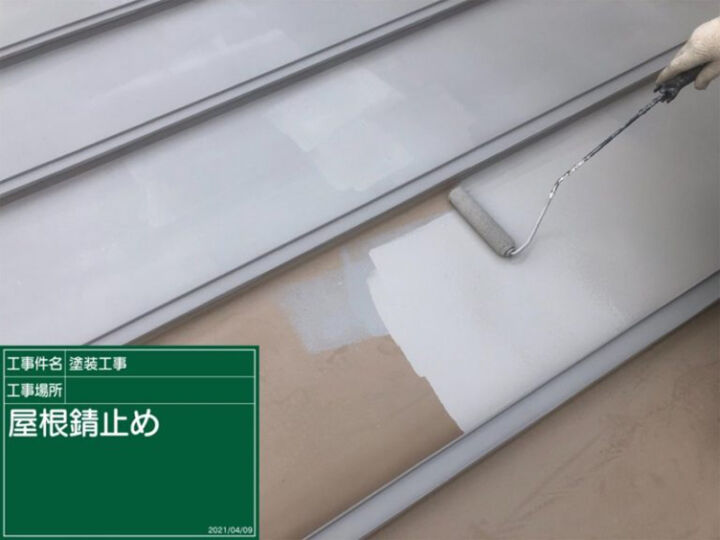 金属屋根のサビの発生を防ぐためにサビ止めを塗っていきます。