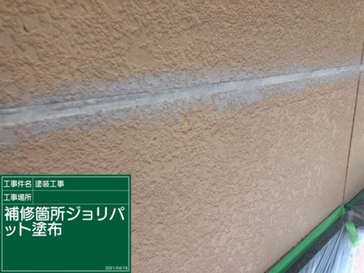 モルタル外壁のひび割れ部などにジョリパットを塗っていきます。