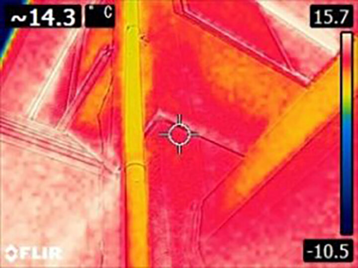 外壁を、サーモカメラで撮影してみると、赤い高温帯が広がっています。