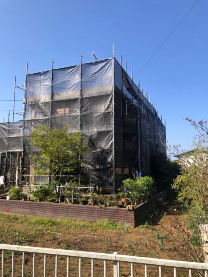 周りを囲むシートは塗料の飛散防止の役目を持っています。