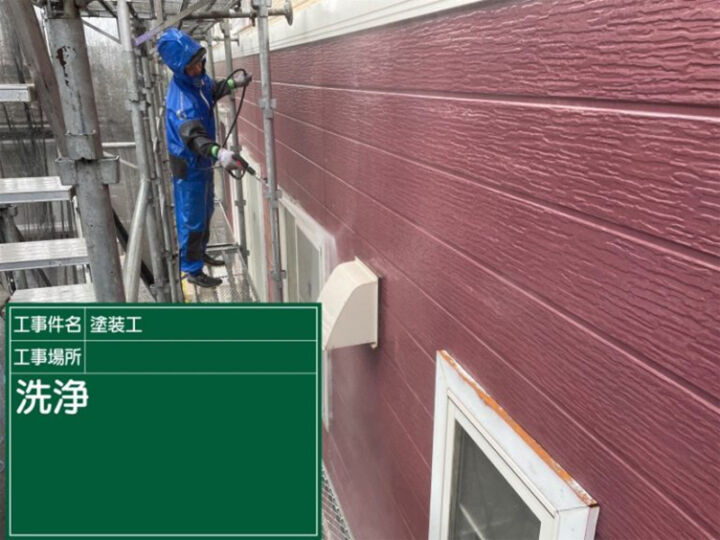 高圧洗浄機で塗装を行う場所を洗浄します。