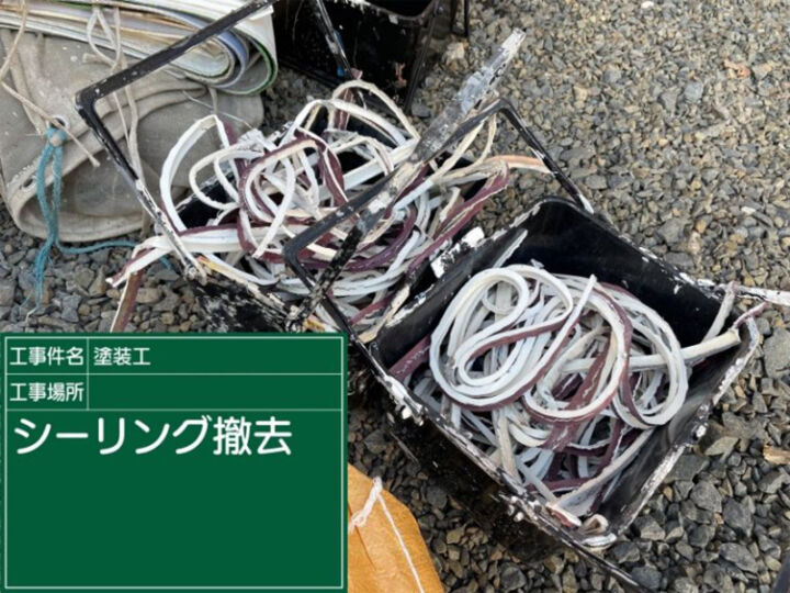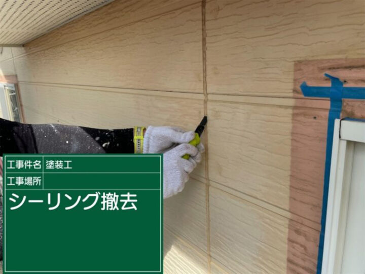 外壁とコーキングの間にカッターを入れて引っ張るとかんたんに剥がすことができます。