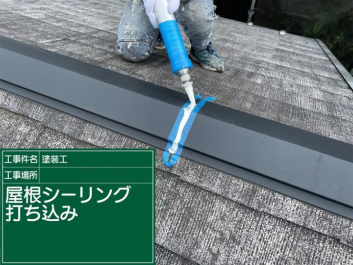 棟板の継ぎ目をコーキングで埋めて雨水の侵入経路を防いでいきます。