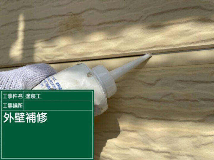 外壁塗装の前にサイディングボードの横目地をコーキングで埋めていきます。