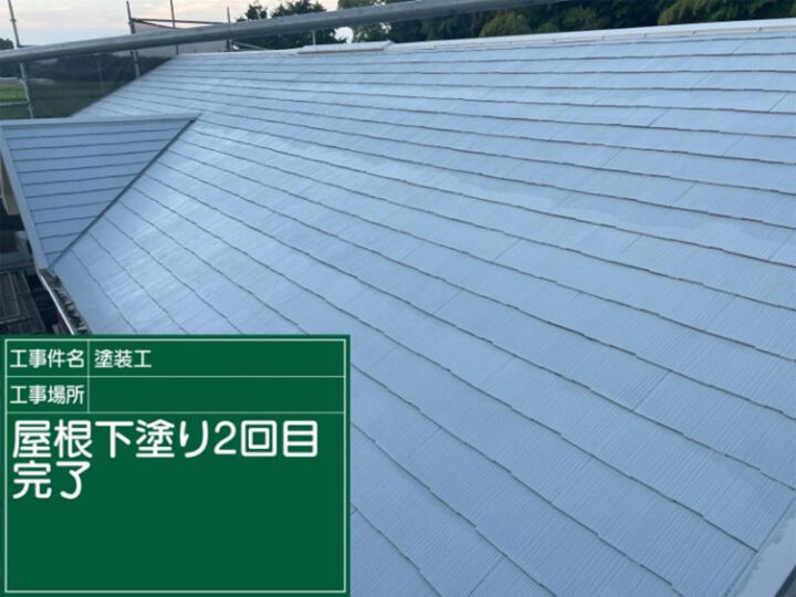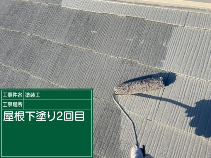 今回の屋根は非常に傷みが激しく、1回の下塗りだけでは浸透にむらがあり、このままだと上塗りで色むらが起きてしまうので、2回下塗りしてしっかり屋根を補強します。